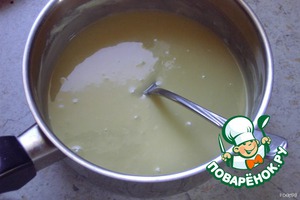 Теперь укладываем первый корж, сверху мочим молоком. Потом - половину крема, потом снова - корж, молоко и крем, последний корж и снова молоко. Молока должно хватить на 3 коржа! А крема - на 2 коржа.