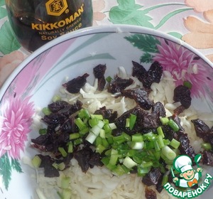 Капусту нашинковать, немного размять руками и смешать с огурцами, черносливом. Добавляем измельченный зеленый лук.