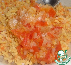 Очистить лук, мелко порезать и протушить до мягкости в растительном масле. Помидор порезать кубиками и добавить к луку. Тушим 2-3 минуты.