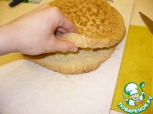 Готовый бисквит нужно остудить и разрезать вдоль на 2 пласта.