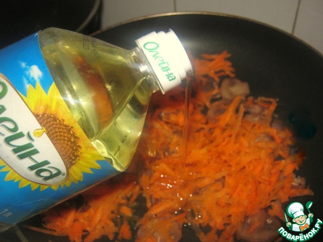 На сковороде обжариваем морковь и грибы с добавлением 50гр масла ТМ "Олейна" пару минут