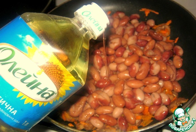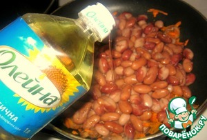 Добавляем фасоль, обжариваем. Масла оказалось мало и я добавила ещё примерно 50гр масла ТМ "Олейна"