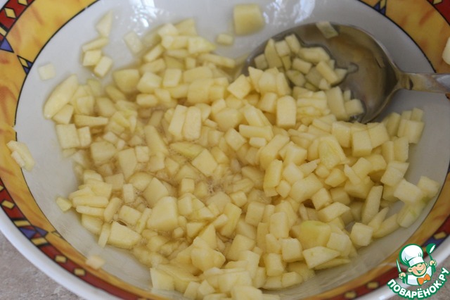 Яблоко очистить от кожуры и сердцевины, нарезать мелкими кубиками. Смешать с 2 ч. л. меда.