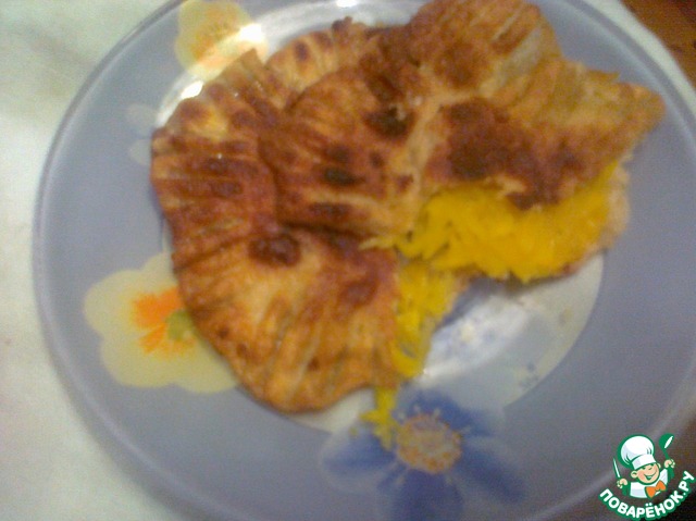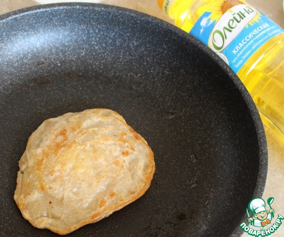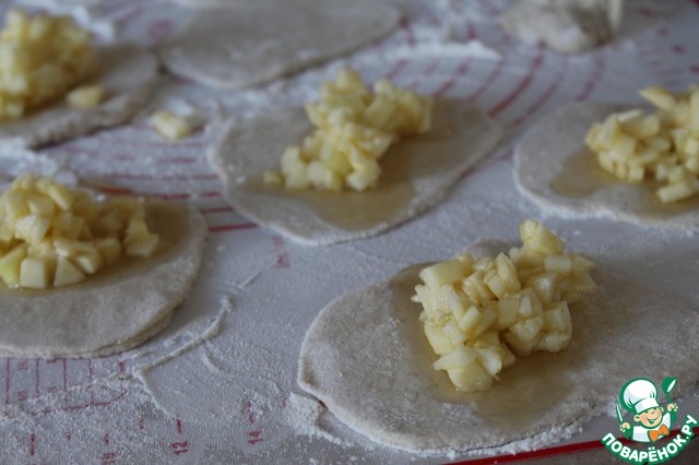 Тесто разделить на 12 шариков, каждый шарик раскатать в лепешку. При раскатке стол и скалку припылять мукой. На 6 лепешек выложить начинку (постарайтесь, чтобы как можно меньше жидкости попало на тесто), сверху накрыть другими лепешками. Края соединить (я для этого использовала вилку).