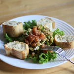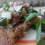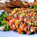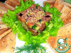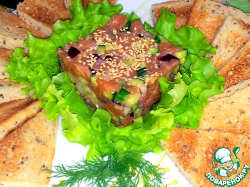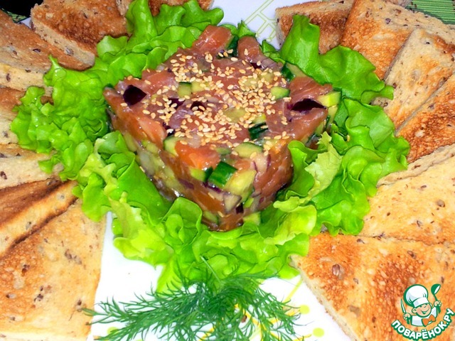 В центре большой тарелки выложить листья салата. Тартар положить в квадратную ( или круглую ) форму, немного уплотнить ложкой и перевалить в центр тарелки на листья.