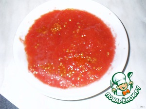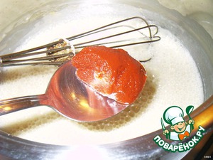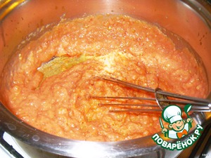 Затем вводим тёртые помидоры и как следует перемешиваем, должна получиться довольно густая масса.