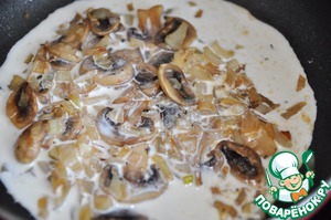 Добавляем горчицу, соль, эстрагон, наливаем шампанское, тушим грибы с луком до выпаривания шампанского.