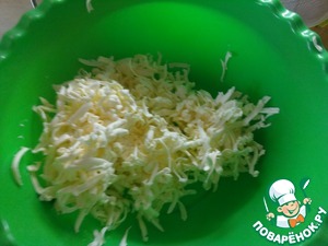 Достать из морозилки маргарин, натереть на крупной терке. Добавить кефир, соду, гашеную уксусом, соль. Перемешать.