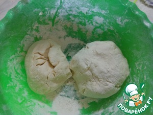 Добавить просеянную муку. Сначала 1-ый стакан, перемешать, потом 2-ой. Замесить эластичное мягкое тесто.