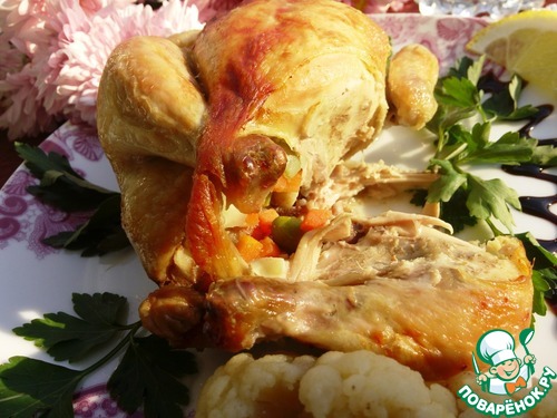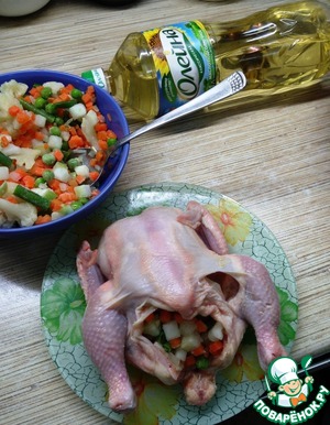 Каждого цыпленка начинить овощной смесью. Ножки скрепить, края крылышек заправить за спинку