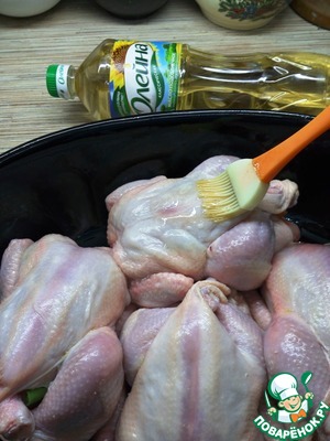 Цыплят выложить в форму, слегка смазанную маслом. Сверху смазать их тонким слоем растительного масла, для красивого "загара". Ставим в духовку выпекаться на полчаса при t 200С. Через полчаса вынимаем цыплят из духовки, сливаем выделившийся сок и ставим в духовку еще на 10 минут.