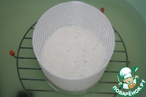 Через полчаса перевернуть сыр. Для этого накрыть ее крышкой или дренажным ковриком (все из той же канвы) и аккуратно перевернуть форму. Сыр сползет вниз и будет прессоваться в другом направлении. Держать в теплой камере 2 часа, каждые полчаса переворачивая. Далее вынуть и поместить решетку от микроволновки над миской, чтобы было куда стекать сыворотке. Дальше держать сыр при комнатной температуре, периодически переворачивая, пока не перестанет выделяться сыворотка.