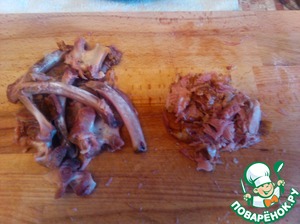 Тем временем с костей ножом аккуратно счищаем мясо. Вот как мало его оказалось - отправляем в кастрюлю