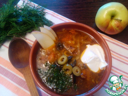 И тут пришла мысль - ведь наши предки на Руси наверняка лимоны-то не каждый день видели - а как же они варили солянку-то без лимонов - что ж кислого-то у них было??? - ЯБЛОКО!!! Ну конечно же!