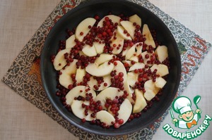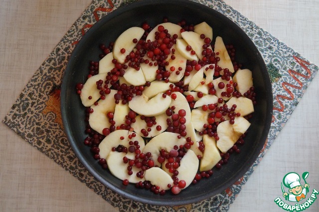 Яблоки чистим от кожуры, удаляем сердцевину, режем на дольки, укладываем в форму. Сверху засыпаем наши ягодки.