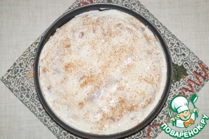В разогретую до 170 градусов духовку ставим форму и выпекаем 20 минут. Время выпекания, вообще-то, зависит от Вашей духовки. Готовность определяем по румяной корочке и сухой спичке. В это время взбиваем сметану и сахар.