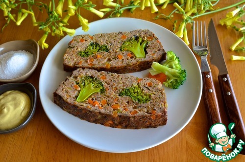 6. Выложить половину фарша в форму, сделать 6 углублений (2 ряда по 3) и «утопить» в каждое по соцветию брокколи.