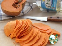 Пока тесто отдыхает, а масло настаивается, займемся тыквой. Её следует помыть, очистить от шкурки и нарезать на тонкие ломтики. Для начинки лучше подходят небольшие сорта тыквы. |