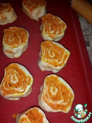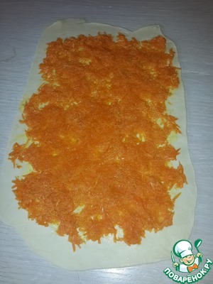 Раскатываем тесто тонко, укладываем морковную начинку и сворачиваем в рулет