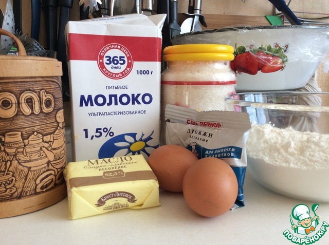 молоко можно чуть подогреть положить сахар 4 ст. л.. соль. дрожжи и сначала 4 ложки муки. размешать всё ложкой и немного подождать. чтобы дрожжи начали работать (появятся пузыри).