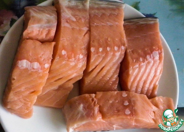 Теперь рыба. Моем, режем на кусочки. Ну или можно не резать. Как хотите.