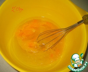 В миске смешиваем яйца, оливковое масло, сахар (высыпаем 1 стак. сахара без 2 ст. л. - они нам понадобятся для присыпки кекса) и апельсиновый сок. Всё перемешиваем.