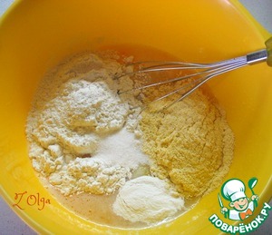 Добавляем два вида муки - пшеничную и кукурузную, щепотку соли, ванильный сахар, разрыхлитель теста (пшеничной муки у меня ушло 1 стак. + 1 ст. л. с горкой). Перемешиваем до однородности. Тесто должно быть как густая сметана.