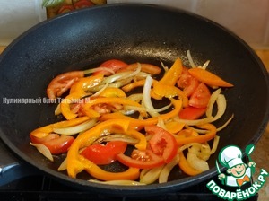 Лук, перец, помидор нарезать и обжарить на масле, на сильном огне, помешивая.