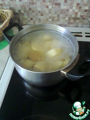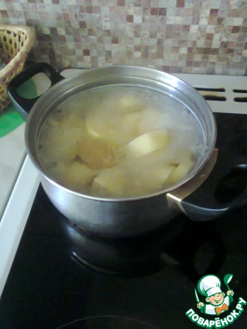 Отварить до мягкости картофель, воду посолить, можно добавить для аромата лавровый лист ( его потом вынуть!)