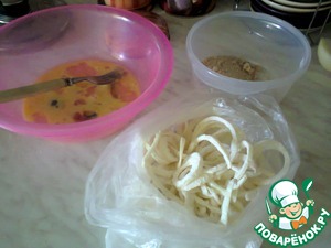 Окунать кольца сначала во взбитое яйцо, затем- в панировочные сухари