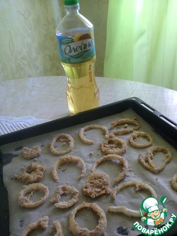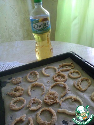 Выложить луковые кольца на противень, выстланный пергаментом, сбрызнуть растительным маслом, выпекать в духовке при 180° до румяного цвета