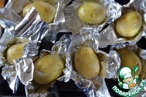 1. Каждую картофелину обмазать подсолнечным маслом, посолить и поперчить, туго завернуть в фольгу и запечь до готовности.