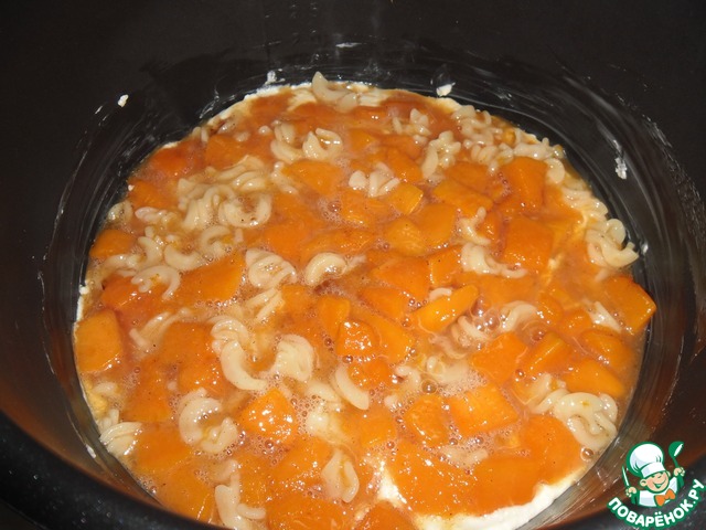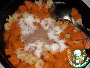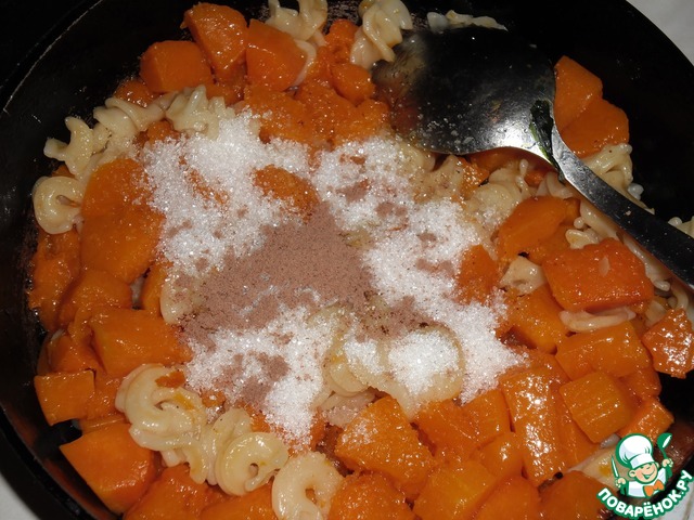 Выложить в тыкву лапшу, сахар, яйца и корицу, все хорошо перемешать. Тыквенный слой к запеканию готов.