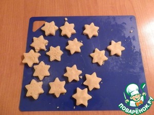 Теперь займёмся декором. Оставшееся тесто можно нарезать на полоски и украсить пирог ими, но в этот раз я вырезала из теста звездочки. Их отправляем в холодильник. Даже после этого тесто остается. Я его замораживаю и впоследствии использую для печенья или пирога.