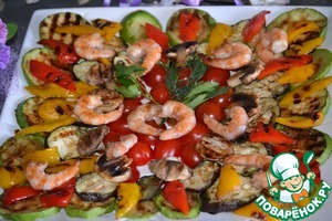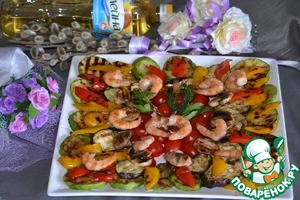 Всё, все наши составляющие готовы! Теперь смело их размещаем на блюде. Я всегда делаю на большом, выкладываю, практически, в один слой, по краям цукини, затем слои баклажан, сверху перчик (его я немного мельче режу после гриля), в центр кладем половинки черри, произвольно сверху грибы и креветки. Сверху ложкой аккуратно распределяем заправку. Заправку готовим из смеси 3 ст. л. масла Олейна, 2 ст. л. соевого соуса, 1 з. чеснока и 1 ст. л. лимонного сока, соль и перчик по вкусу.