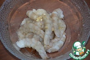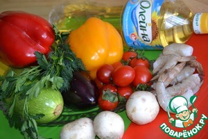 Готовим продукты для нашего салат-закуски, овощи и грибы моем, креветки чистим от панциря.