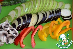 Нарезаем кабачок и баклажан кружочками, толщиной, примерно, 4 мм, перец на полоски.