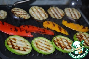 Разогретый гриль смазываем при помощи кисточки маслом Олейна и выкладываем овощи. Постепенно все пережариваем.