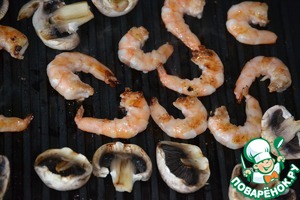 Очень вкусное и быстрое блюдо на гриле. Маринованные креветки-гриль прекрасно сочетаются с овощами и грибами, пикантный соус дополняет полный вкус этого блюда. Вкусно, просто, низкокалорийно и по весеннему - ярко!!!