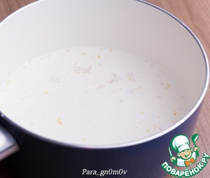 1. Сливки налить в огнеупорную форму и замочить в них желатин на 30 минут. -