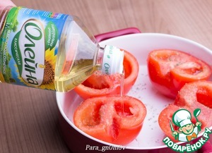 2. Помидоры разрезать пополам, удалить семена и сок. Они нам не понадобятся. Форму для выпечки чуть смазать маслом, выложить половинки помидоров, слегка посыпать мятой (если не уверены, что с мятой понравится, то лучше ее не добавлять). Сверху равномерно полить помидоры небольшим количеством масла (около 0,5 ч. л. на половинку) и слегка посыпать сахаром. Запекать при 180 градусах около 30 минут.