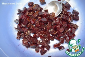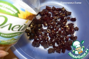 Свеклу нарезать маленькими кубиками, поместить в миску и немного добавить растительного масла.
