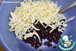 Капусту тонко нашинковать. Если у вас белокочанная, как у меня, то слегка помните ее в руках.