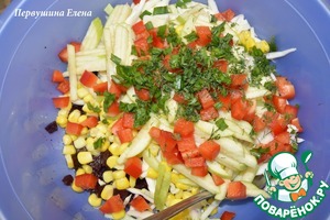 болгарский перец нарезанный мелкими кубиками и измельченную зелень.