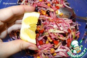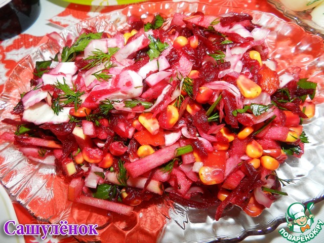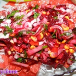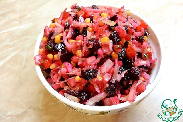 Перемешать и дать постоять минут 5-10. Это делается для того, чтобы свекла не сильно окрасила другие ингредиенты. А так свекла отдаст лишь небольшую часть своего цвета и овощи приобретут розоватый оттенок, оставшись при этом четко различимыми.