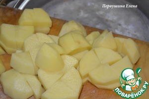 Картофель нарезать кубиками или брусочками и, когда бобовые будут почти готовы (мягкие, но еще упругие), добавить картофель,