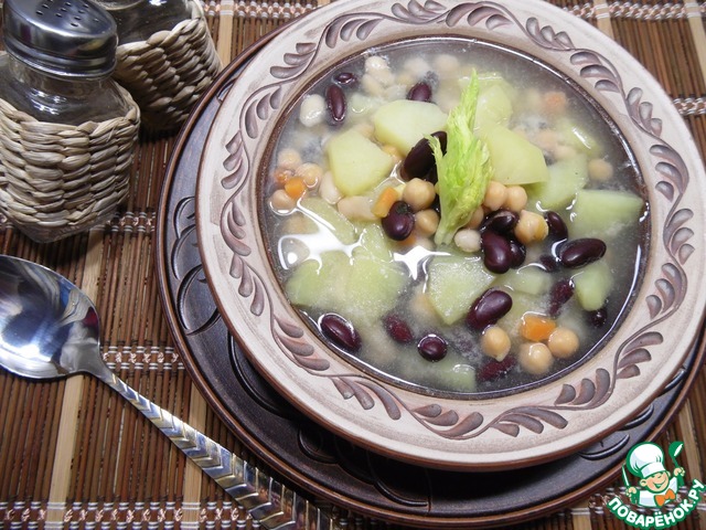 [+5]Так как времени катастрофически не хватает, делала суп из консервированных фасоли и нута.Надеюсь, что это не сильно повлияло на вкус... В отпуске обязательно сделаю все в точности по рецепту!