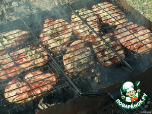 Разместить мясо на решeтке для гриля и пожарить на углях, периодически переворачивая.