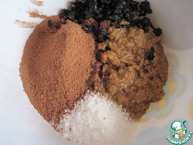 Измельчим в блендере нут, добавив в чашу кофе, кленовый сироп и коньяк, который не впитался в чернослив. Мне жидкости понадобилось чуть больше - я добавила ещё пару столовых ложек сиропа в процессе измельчения нута. Отдельно измельчим в муку 20 г кокосовой стружки. Чернослив мелко нарежем. Измельчённую нутовую массу выкладываем в миску, добавляем кокосовую муку, какао-порошок и нарезанный чернослив.
