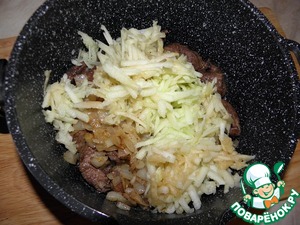 Яблоко очистить и натереть, выложить сверху мяса и лука -